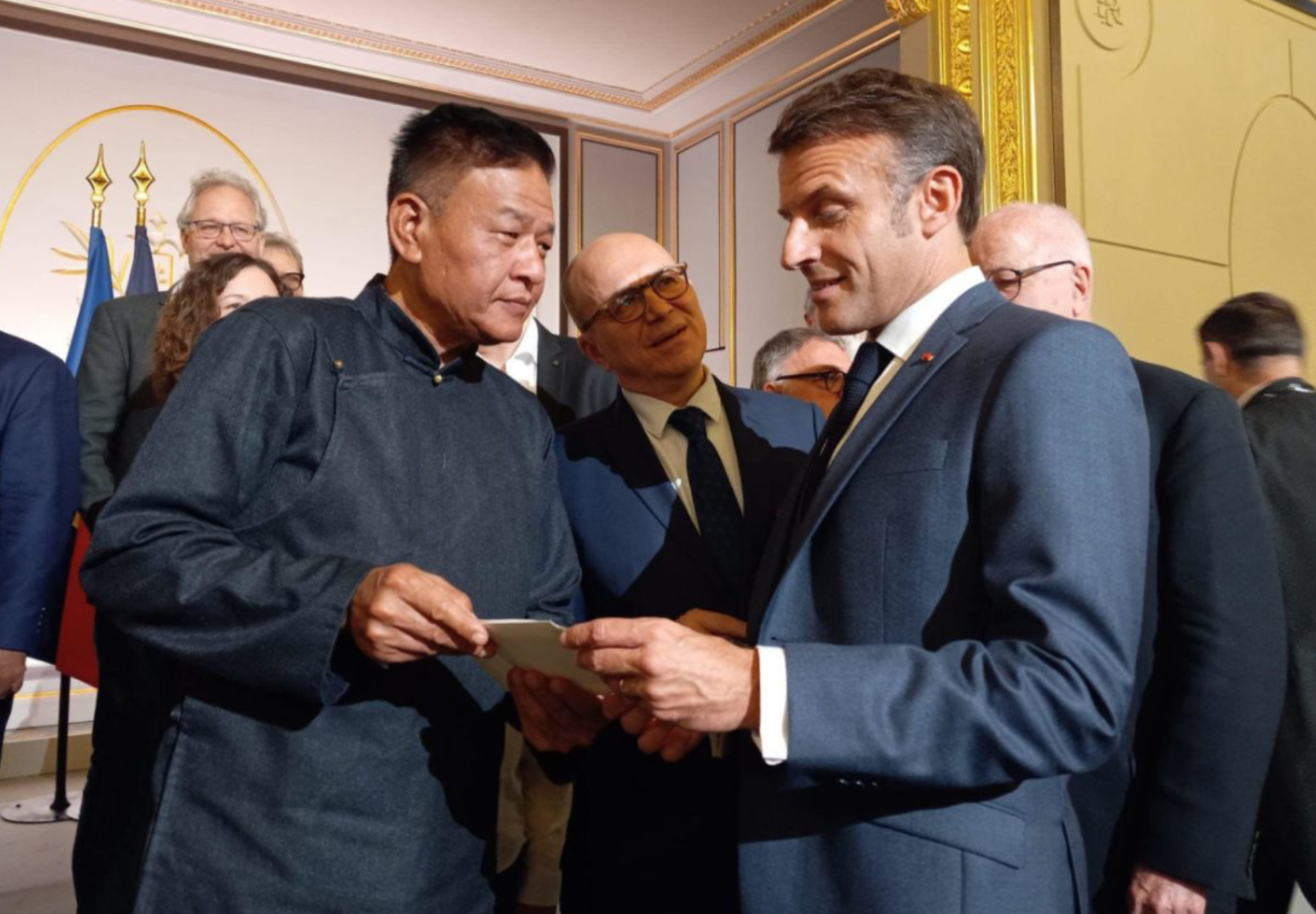 སྤེན་པ་ཚེ་རིང་། མཛད་སྒོ་འཚོག་ས་གང་ཡིན་མིན་དེ་ངས་བསམས་ན་ཁྱེད་ཀྱིས་ཏག་ཏག་མཁྱེན་གྱི་ཡོད་པ་རེད། སྲིད་འཛིན་ཕོ་བྲང་(Palais De Elysée)ནང་ལ་རེད། འདི་བོད་མི་མང་གིས་འོས་འདེམས་བྱས་པའི་བཙན་བྱོལ་བོད་གཞུང་གི་དབུ་ཁྲིད་ཅིག་(རྒྱལ་ཁབ་གཞན་གྱི་)སྲིད་འཛིན་དང་མཇལ་འཕྲད་གནང་བ་ཐོག་མ་དེ་རེད། དེར་བརྟེན། འདི་ནི་གཟི་བརྗིད་ཅིག་ཡིན་པ་མ་ཟད། འདིས་སྲིད་འཛིན་མཱ་ཁུ་རོང་གི་འགྲོ་བ་མིའི་ཐོབ་ཐང་ཐད་ཀྱི་ཁས་ལེན་དམ་བཅའ་ཡང་མཚོན་གྱི་ཡོད་པ་རེད། ངས་བསམས་ན་ཁོང་གིས་ང་ཚོ་སུ་ཡིན་མིན་མཁྱེན་གྱི་ཡོད་པ་རེད་འདོད། སྐབས་དེར་ང་གཅིག་བུ་མིན་པར། ད་དུང་ཧྥ་རན་སིར་བཅའ་སྡོད་ཐེ་ཝན་གྱི་གཞུང་ཚབ་ཆེན་མོ་ཝུ་ཀྲི་ཀྲོང་(吴志忠)ཡང་ལྷན་དུ་ཡོད་པ་རེད། སྲིད་འཛིན་མཆོག་གིས་གྷ་ཏོ་ལིང་ལ་གཟེངས་རྟགས་སྩོལ་སྐབས་ཀྱི་གཏམ་བཤད་ནང་དུའང་བོད་དང་ཐེ་ཝན། ཡུ་གུར་བ་སོགས་གླེང་སློང་གནང་སོང་། གྷ་ཏོ་ལིང་གིས་ད་བར་དུ་ཚོགས་སྡེ་འདི་དག་ལ་སྲུང་སྐྱོབ་ཀྱི་ཕྱག་ལས་གནང་ཡོད་པ་རེད། སོང་ཙང་། སྲིད་འཛིན་མཱ་ཁུ་རོང་གིས་སྐབས་དེར་ཁོང་གིས་གང་གསུང་གི་ཡོད་པ་དེ་གསལ་བོར་མཁྱེན་གྱི་ཡོད་པ་རེད་འདོད། ངས་ད་དུང་ཁོང་ལ་ཕྱི་ལོ་ ༢༠༡༦ ལོར་ཁོ་རང་དཔལ་འབྱོར་བློན་ཆེན་ཡིན་སྐབས་༧གོང་ས་མཆོག་ལ་མཇལ་ཁ་ཞུས་སྐབས་ཀྱི་པར་ཞིག་ཕུལ་བ་ཡིན། འདྲ་པར་དེའི་སྟེང་༧གོང་ས་མཆོག་སྐུ་དངོས་ཀྱི་མཚན་རྟགས་བཀོད་ཡོད། ང་ཚོས་འདྲ་པར་དེའི་སྐོར་ནས་གླེང་མོལ་བྱས་པ་ཡིན། འདི་ནི་འདས་པ་ཕྱིར་དྲན་གྱི་ཐབས་ལམ་ཡག་ཤོས་ཤིག་རེད་འདོད། དེ་ནས་ངས་ཁོང་ལ་བོད་མ་བརྗེད་རོགས་ཞེས་ཞུས་པ་ཡིན། ཁོང་གིས་ ‘‘ཡིན་དང་ཡིན། བརྗེད་མི་སྲིད་’’ཅེས་གསུངས་སོང་།